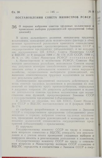 Постановление Совета Министров РСФСР. О порядке избрания советов трудовых коллективов и проведения выборов руководителей предприятий (объединений). 24 февраля 1988 г. № 64