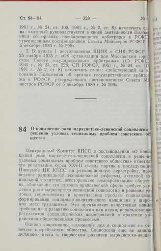 Постановление Совета Министров РСФСР. О повышении роли марксистско-ленинской социологии в решении узловых социальных проблем советского общества. 7 июля 1988 г. № 256