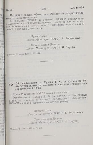 Постановление Совета Министров РСФСР. Об освобождении т. Куцева Г. Ф. от должности заместителя Министра высшего и среднего специального образования РСФСР. 2 июня 1988 г. № 216