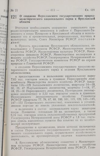 Постановление Совета Министров РСФСР. О создании Переславского государственного природно-исторического национального парка в Ярославской области. 26 сентября 1988 г. № 400