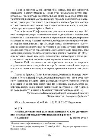 Из акта Логишинской районной комиссии ЧГК об уничтожении немецкими оккупантами населения в районе. г. п. Логишин. 22 апреля 1945 г. // НАРБ. Ф. 845. Оп. 1 Д. 69. Л. 17–17об. Заверенная копия.