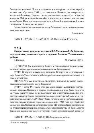 Из протокола допроса свидетеля В.Е. Маслова об убийстве немецкими оккупантами евреев в деревне Словени Толочинского района. д. Словени. 24 декабря 1945 г. // НАРБ. Ф. 1363. Оп. 1. Д. 346. Л. 314. Заверенная копия.