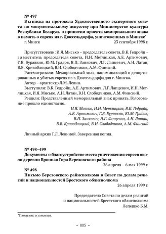 Документы о благоустройстве места уничтожения евреев около деревни Бронная Гора Березовского района. Письмо Березовского райисполкома в Совет по делам религий и национальностей Брестского облисполкома. 26 апреля 1999 г. // НАРБ. Ф. 136. Оп. 3. Д. 82. Л. 104–105. Подлинник.