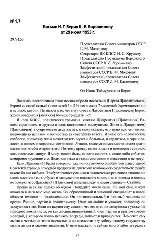 Письмо Н. Т. Берия К. Е. Ворошилову от 29 июня 1953 г.