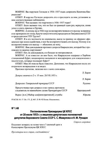 Постановление Президиума ЦК КПСС от 28 июля 1953 г. о лишении депутатских полномочий депутатов Верховного Совета СССР С. С. Мамулова и Н. М. Рухадзе. Выписка из протокола № 20 заседания Президиума ЦК от 28 июля 1953 г. // РГАСПИ. Ф. 17. Оп. 171. Д. 465. Л. 95 Копия. Машинопись.
