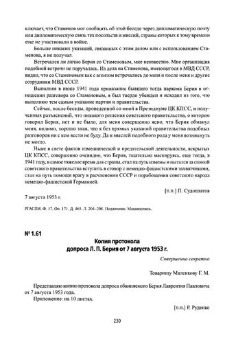 Копия протокола допроса Л. П. Берия от 7 августа 1953 г. // РГАСПИ. Ф. 17. Оп. 171. Д. 465. Л. 214-224. Копия. Машинопись.