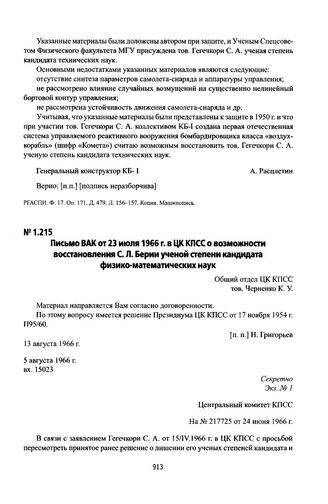 Письмо ВАК от 23 июля 1966 г. в ЦК КПСС о возможности восстановления С. Л. Берии ученой степени кандидата физико-математических наук // РГАСПИ. Ф. 17. Оп. 171. Д. 479. Л. 158-159. Подлинник. Машинопись.