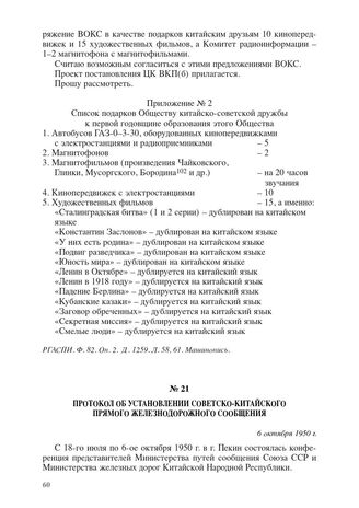 Протокол об установлении советско-китайского прямого железнодорожного сообщения. 6 октября 1950 г. // РГАЭ. Ф. 1884. Оп. 60. Д. 169. Л. 301–302. Машинопись. Заверенная копия.