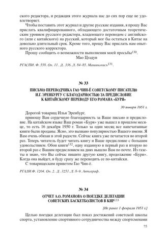 Письмо переводчика Гао Чин-ё советскому писателю И.Г. Эренбургу с благодарностью за предисловие к китайскому переводу его романа «Буря». 30 января 1951 г. // РГАЛИ.Ф. 1204. Оп. 2. Д. 3251. Л. 8–9. Автограф.