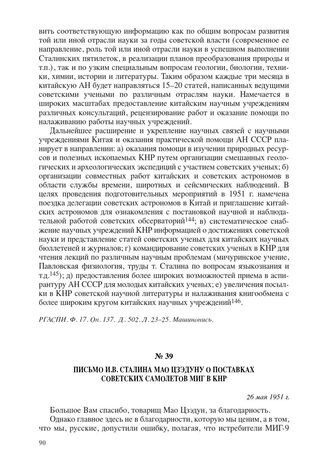 Письмо И.В. Сталина Мао Цзэдуну о поставках советских самолетов МИГ в КНР. 26 мая 1951 г. // РГАСПИ. Ф. 558. Оп. 11. Д. 338. Л. 91. Машинопись.