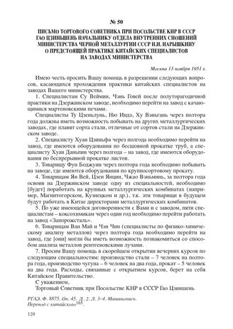 Письмо торгового советника при Посольстве КНР в СССР Гао Цзиншеня начальнику отдела внутренних сношений Министерства черной металлургии СССР Н.И. Нарышкину о предстоящей практике китайских специалистов на заводах министерства. Москва, 13 ноября 1951 г. // РГАЭ. Ф. 8875. Оп. 45. Д. 2. Л. 3–4. Машинопись. Перевод с китайского.