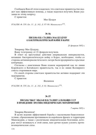 Письмо И.В. Сталина Мао Цзэдуну о бактериологической войне в Корее. 23 февраля 1952 г. // РГАСПИ. Ф. 558. Оп. 11. Д. 342. Л. 92. Машинопись.