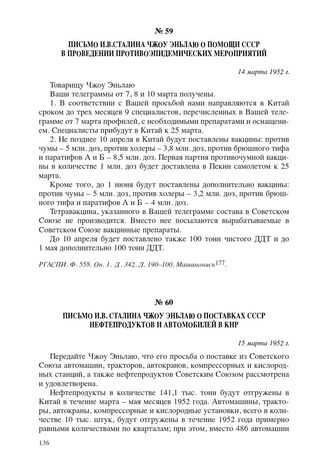 Письмо И.В. Сталина Чжоу Эньлаю о помощи СССР в проведении противоэпидемических мероприятий. 14 марта 1952 г. // РГАСПИ. Ф. 558. Оп. 1. Д. 342. Л. 190–100. Машинопись.