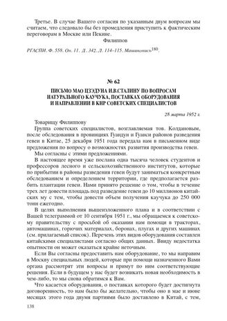Письмо Мао Цзэдуна И.В. Сталину по вопросам натурального каучука, поставках оборудования и направлении в КНР советских специалистов. 28 марта 1952 г. // РГАСПИ. Ф. 558. Оп. 11. Д. 342. Л. 122–123. Машинопись.