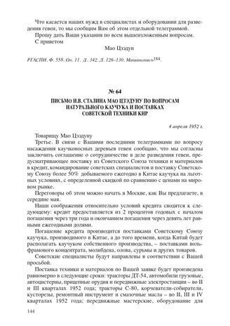 Письмо И.В. Сталина Мао Цзэдуну по вопросам натурального каучука и поставках советской техники в КНР. 4 апреля 1952 г. // РГАСПИ. Ф. 558. Оп. 11. Д. 343. Л. 5–6. Машинопись.