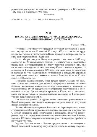 Письмо И.В. Сталина Мао Цзэдуну о советских поставках вооружения и военного имущества в КНР. 9 апреля 1952 г. // РГАСПИ. Ф. 558. Оп. 11. Д. 343. Л. 8–9. Машинопись.