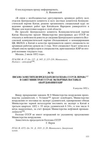 Письмо заместителя председателя Госплана СССР Г.В. Перова в Совет Министров СССР об экспортных поставках оборудования в КНР. 9 августа 1952 г. // РГАЭ. Ф. 4372. Оп. 54. Д. 1031. Л. 28. Машинопись. Заверенная копия.