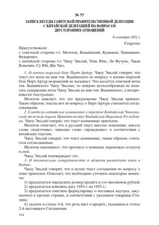 Запись беседы советской правительственной делегации с китайской делегацией по вопросам двусторонних отношений. 8 сентября 1952 г. // РГАСПИ. Ф. 82. Оп. 2. Д. 1258. Л. 59–64. Машинопись.