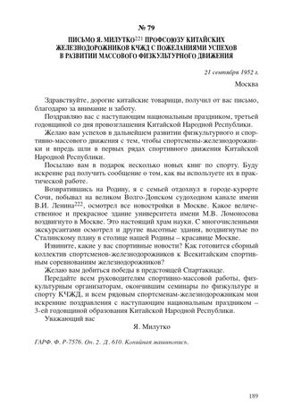 Письмо Я. Милутко профсоюзу китайских железнодорожников КЧЖД с пожеланиями успехов в развитии массового физкультурного движения. 21 сентября 1952 г. Москва // ГАРФ. Ф. Р-7576. Оп. 2. Д. 610. Копийная машинопись.