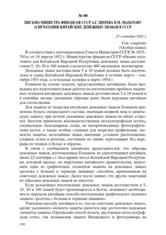 Письмо министра финансов СССР А.Г. Зверева В.М. Молотову о печатании китайских денежных знаков в СССР. 25 сентября 1952 г. // РГАСПИ. Ф. 82. Оп. 2. Д. 1258. Л. 93–94. Машинопись.