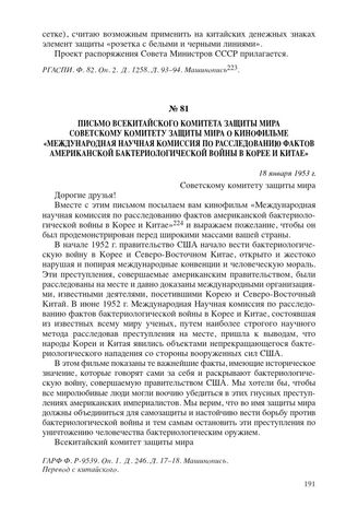 Письмо Всекитайского комитета защиты мира Советскому комитету защиты мира о кинофильме «Международная научная комиссия по расследованию фактов американской бактериологической войны в Корее и Китае». 18 января 1953 г. // ГАРФ Ф. Р-9539. Оп. 1. Д. 246. Л. 17–18. Машинопись. Перевод с китайского.