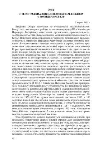 Отчет сотрудника ВНИИ антибиотиков Г.М. Васильева о командировке в КНР. 7 марта 1953 г. // РГАНТД. Ф. 279. Оп. 5–1. Д. 10. Л. 2–22, 29–43. Подлинник. Машинопись. Подпись – автограф.