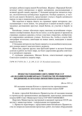 Проект постановления Совета Министров СССР «Об оказании помощи Китаю в строительстве промышленных предприятий, намечаемых пятилетним планом КНР». Весна 1953 г. // РГАЭ. Ф. 4372. Оп. 11. Д. 995. Л. 26–32. Машинопись.