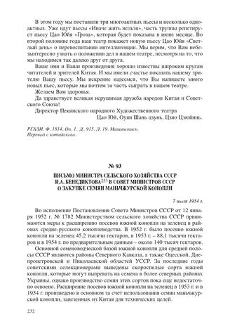 Письмо министра сельского хозяйства СССР И.А. Бенедиктова в Совет Министров СССР о закупке семян маньчжурской конопли. 7 июля 1954 г. // РГАЭ. Ф. 4372. Оп. 54. Д. 925. Л. 92–93. Машинопись. Заверенная копия.