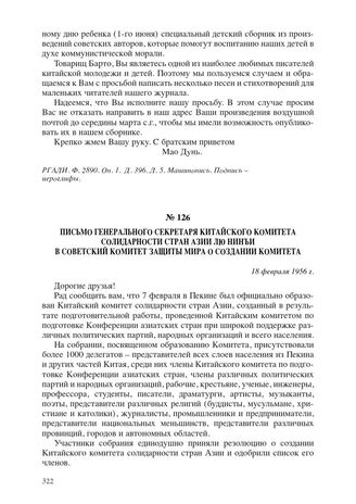 Письмо генерального секретаря Китайского комитета солидарности стран Азии Лю Нинъи в Советский комитет защиты мира о создании комитета. 18 февраля 1956 г. // ГАРФ. Ф. Р-9539. Оп. 1. Д. 476. Л. 67–68. Машинопись.