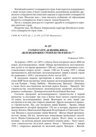 Статья в газете «Жэньминь жибао» «Железнодорожное строительство в Китае». 19 февраля 1956 г. // РГАНИ. Ф. 5. Оп. 31. Д. 168. Л. 176–178. Машинопись.
