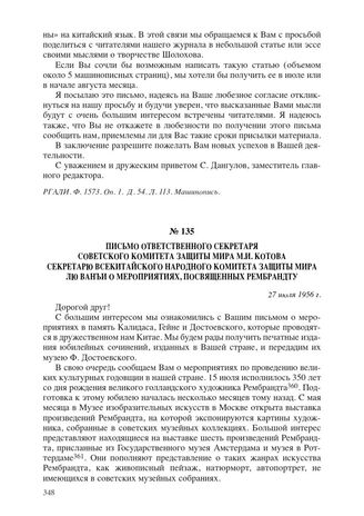 Письмо ответственного секретаря Советского комитета защиты мира М.И. Котова секретарю Всекитайского народного комитета защиты мира Лю Ванъи о мероприятиях, посвященных Рембрандту. 27 июля 1956 г. // ГАРФ. Ф. Р-9539. Оп. 1. Д. 476. Л. 149–150. Машинопись.