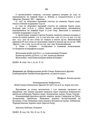 Шифрограмма штаба Северо-Кавказского фронта командующему Закавказским фронтом. 12 августа 1942 г. // ЦАМО. Ф. 224. Оп. 760. Д. 22. Л. 63.