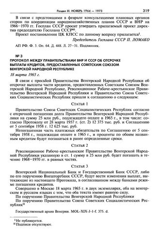 Протокол между правительствами ВНР и СССР об отсрочке выплаты кредитов, предоставленных Советским Союзом Венгерской Народной Республике. 18 марта 1965 г. // Государственный архив Венгрии. MOL-XIX-J-1-f. 375. d.