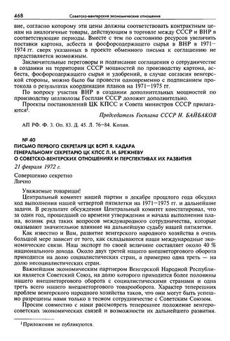Письмо Первого секретаря ЦК ВСРП Я. Кадара Генеральному секретарю ЦК КПСС Л. И. Брежневу о советско-венгерских отношениях и перспективах их развития. 21 февраля 1972 г.