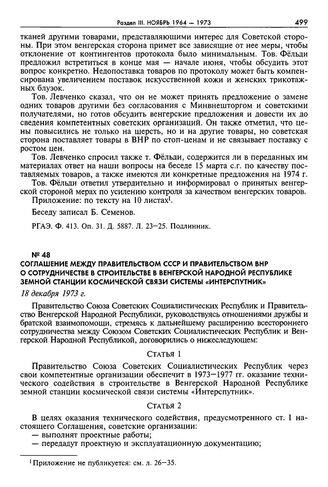 Соглашение между правительством СССР и правительством ВНР о сотрудничестве в строительстве в Венгерской Народной Республике земной станции космической связи системы «Интерспутник». 18 декабря 1973 г. // Публикуется по: Сборник действующих договоров, соглашений и конвенций, заключенных СССР с иностранными государствами. Вып. XXIX. М.: Международные отношения, 1975. С. 279—280.