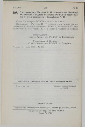 Постановление Совета Министров СССР. О назначении т. Михеева Н.Н. заместителем Министра мелиорации и водного хозяйства РСФСР и освобождении от этой должности т. Беззубенко А.И. 18 августа 1983 г. № 394.