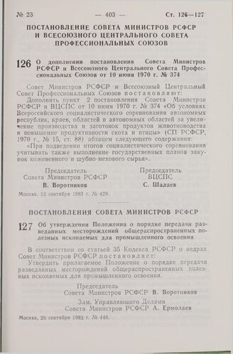 Постановление Совета Министров СССР. Об утверждении Положения о порядке передачи разведанных месторождений общераспространенных полезных ископаемых для промышленного освоения. 26 сентября 1983 г. № 446