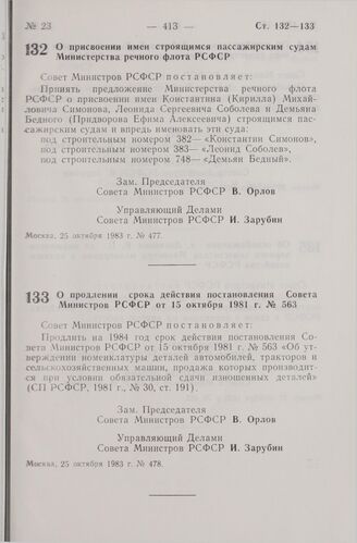 Постановление Совета Министров СССР. О продлении срока действия постановления Совета Министров РСФСР от 15 октября 1981 г. № 563. 25 октября 1983 г. № 478.