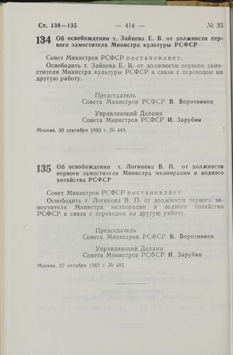 Постановление Совета Министров СССР. Об освобождении т. Зайцева Е.В. от должности первого заместителя Министра культуры РСФСР. 30 сентября 1983 г. № 449