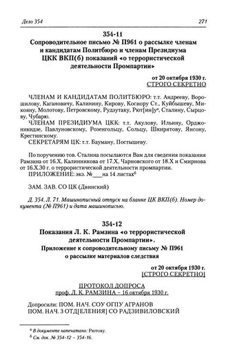 Показания Л. К. Рамзина «о террористической деятельности Промпартии». Приложение к сопроводительному письму № П961 о рассылке материалов следствия от 20 октября 1930 г. // Д. 354. Л. 72-77.