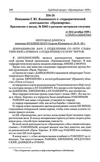 Показания Г. Ю. Козлинского о «террористической деятельности» «Промпартии». Приложение к письму № П962 о рассылке материалов следствия от 2[1] октября 1930 г. // Д. 354. Л. 120-129.