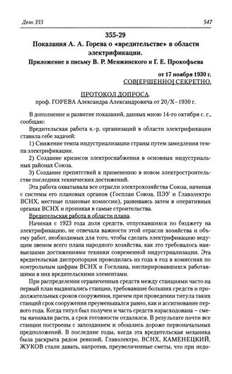 Показания А. А. Горева о «вредительстве» в области электрификации. Приложение к письму В. Р. Менжинского и Г. Е. Прокофьева от 17 ноября 1930 г. // Д. 355. Л. 176-181.