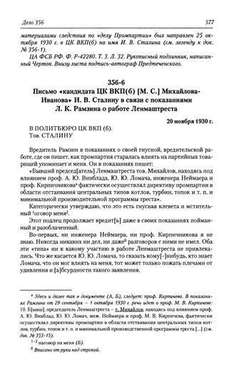 Письмо «кандидата ЦК ВКП(б) [М. С.] Михайлова-Иванова» И. В. Сталину в связи с показаниями Л. К. Рамзина о работе Ленмаштреста. 20 ноября 1930 г. // Д. 356. Л. 6-9.