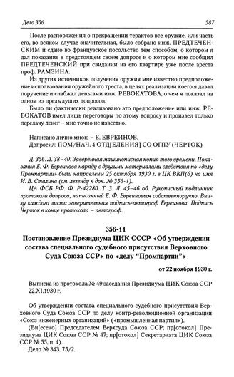 Постановление Президиума ЦИК СССР «Об утверждении состава специального судебного присутствия Верховного Суда Союза ССР» по «делу «Промпартии»» от 22 ноября 1930 г. // Д. 356. Л. 12.