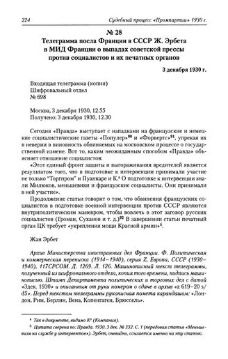 Телеграмма посла Франции в СССР Ж. Эрбета в МИД Франции о выпадах советской прессы против социалистов и их печатных органов. 3 декабря 1930 г. // Архив Министерства иностранных дел Франции. Ф. Политическая и коммерческая переписка (1914-1940), серия Z, Европа, СССР (1930-1940), 117СРСОМ. Д. 1269. Л. 126.