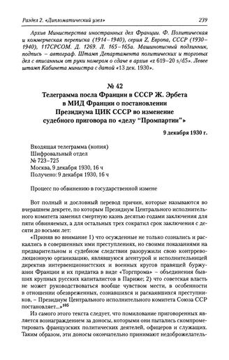 Телеграмма посла Франции в СССР Ж. Эрбета в МИД Франции о постановлении Президиума ЦИК СССР во изменение судебного приговора по «делу «Промпартии»». 9 декабря 1930 г. // Архив Министерства иностранных дел Франции. Ф. Политическая и коммерческая переписка (1914-1940), серия Z, Европа, СССР (1930-1940), 117СРСOМ. Д. 1269. Л. 168-170.