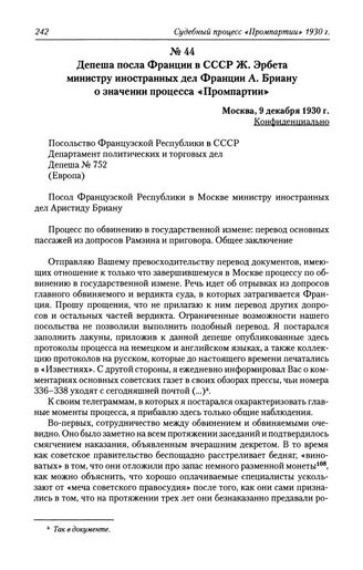 Депеша посла Франции в СССР Ж. Эрбета министру иностранных дел Франции А. Бриану о значении процесса «Промпартии». Москва, 9 декабря 1930 г. // Архив Министерства иностранных дел Франции. Ф. Политическая и коммерческая переписка (1914-1940), серия Z, Европа, СССР (1930-1940), 117СРСОМ. Д. 1269. Л. 177-180а.