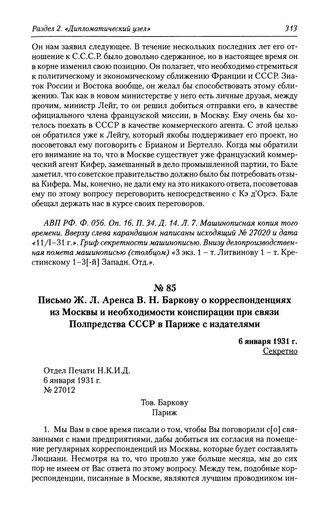 Письмо Ж. Л. Аренса В. Н. Баркову о корреспонденциях из Москвы и необходимости конспирации при связи Полпредства СССР в Париже с издателями. 6 января 1931 г.