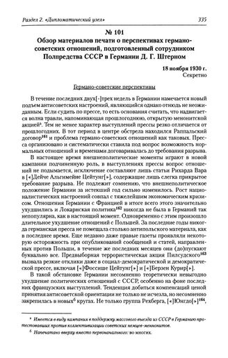 Обзор материалов печати о перспективах германо-советских отношений, подготовленный сотрудником Полпредства СССР в Германии Д. Г. Штерном. 18 ноября 1930 г.