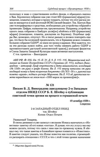 Письмо Б. Д. Виноградова заведующему 2-м Западным отделом НКИД СССР Б. Е. Штейну о публикации советской точки зрения на процесс в германской печати. 19 декабря 1930 г. // АВП РФ. Ф. 056. Оп. 15. П. 31. Д. 9. Л. 123-124.